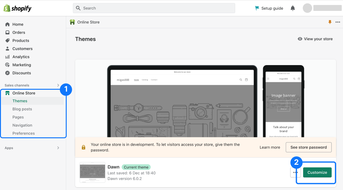 Open your Shopify Dashboard, navigate to Online Store and then click on Customize