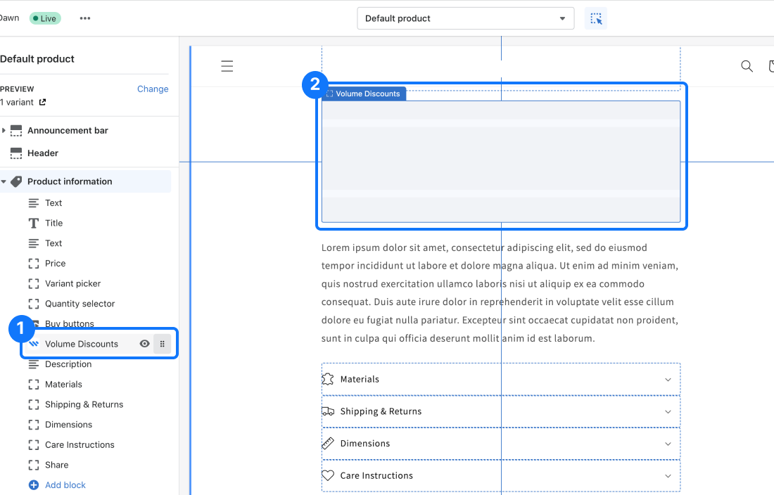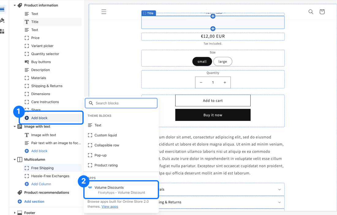 On the left-side panel under the desired section click Add Block and then under APPS click on FloatyApps - Volume Discounts. If the app is not listed under the "APPS" then you might need to enable it by clicking on "App embeds" (left-side menu) and toggle the app there to enable it.